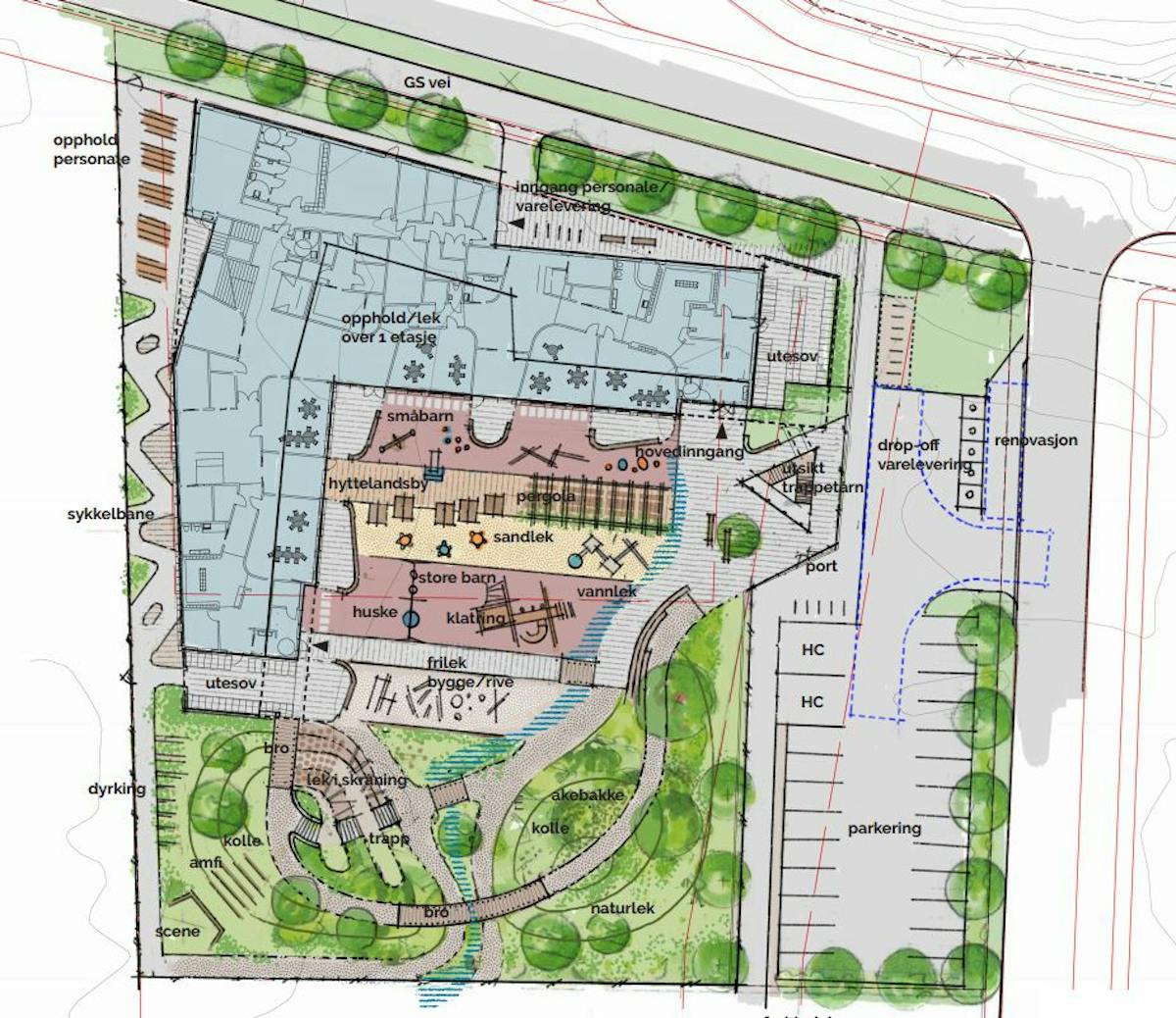 Om prosjektet: Ny 10 avdelings barnehage for ullensaker kommune. Barnehagen er plassert på en liten tomt. Deler av taket må være tilgjengelig for lek for å få tilstrekkelig uteoppholdsareal.